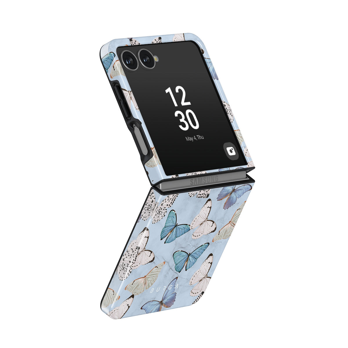 Pastel blue and a playful pattern of summery butterflies create a dreamy combination in our Samsung Galaxy Z Flip 7 phone case. Carry the feeling of the butterflies in your stomach while protecting your phone from any dangers, as the hard-shell case will keep it sound and safe.