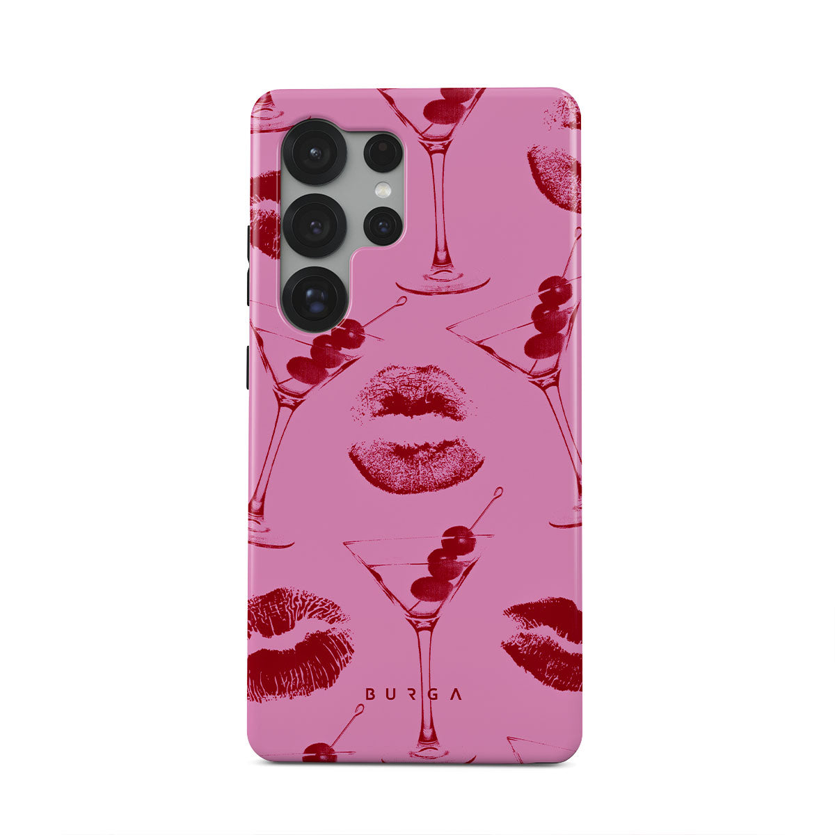 This design features: red lips, kisses, cocktail glasses, martinis