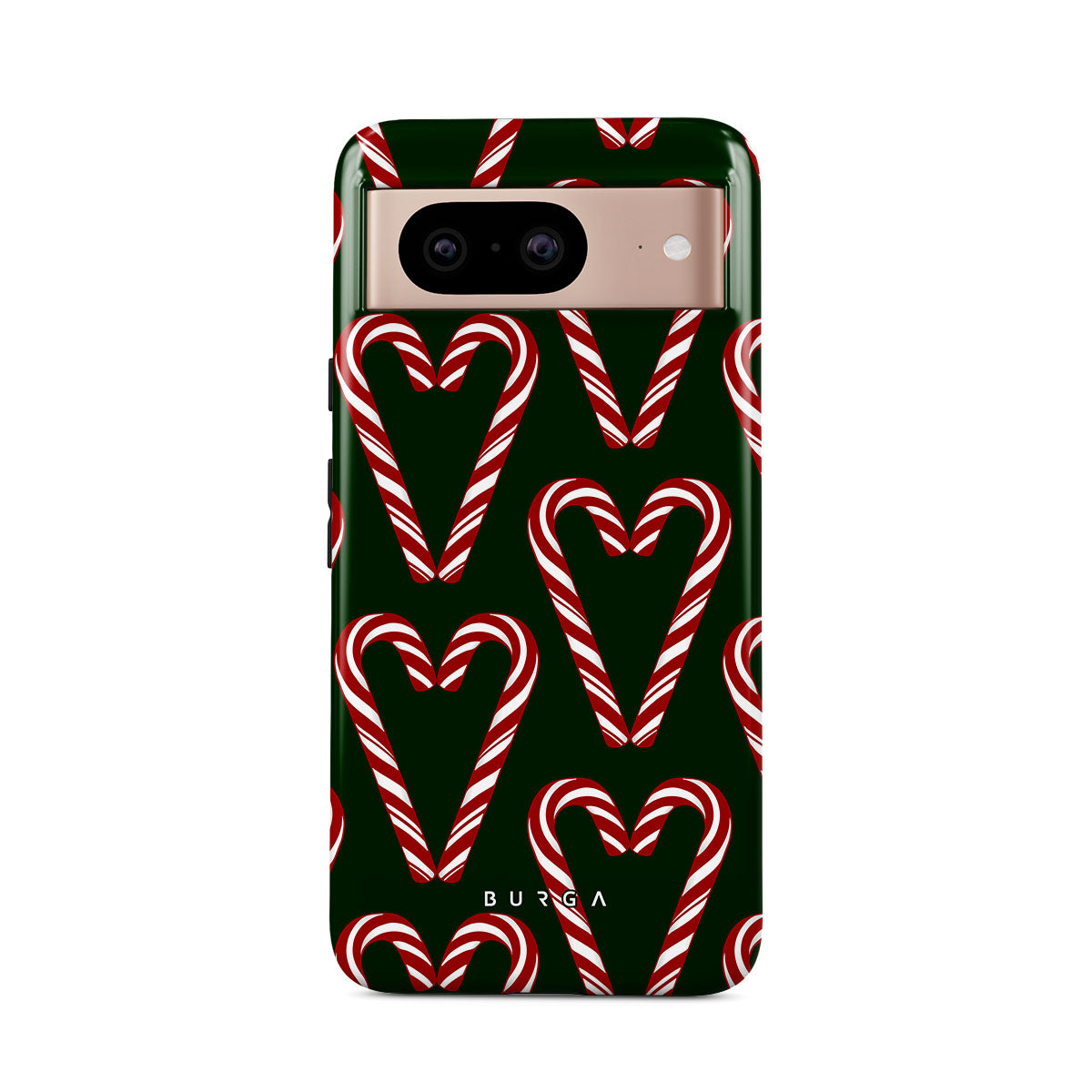 Vibrant and playful, our Candy Cane Google Pixel 8 Case phone case design showcases candy cane heart motifs against a dark green background—a delightful choice for those who love a touch of whimsy and nostalgia.