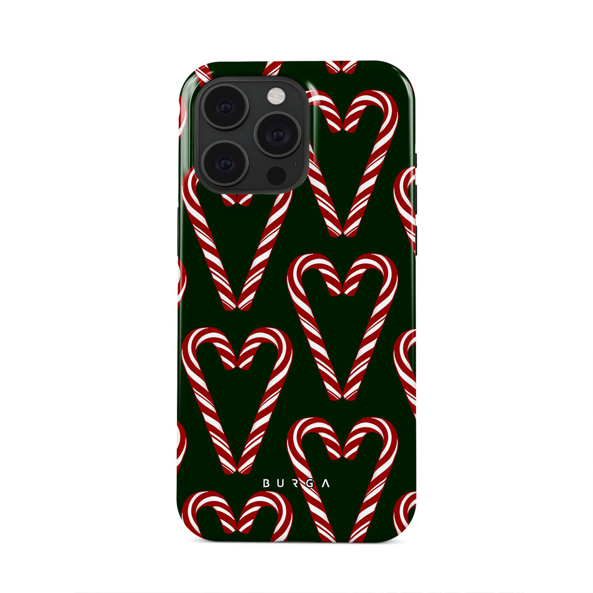 Vibrant and playful, our Candy Cane iPhone 15 Pro Case phone case design showcases candy cane heart motifs against a dark green background—a delightful choice for those who love a touch of whimsy and nostalgia.
