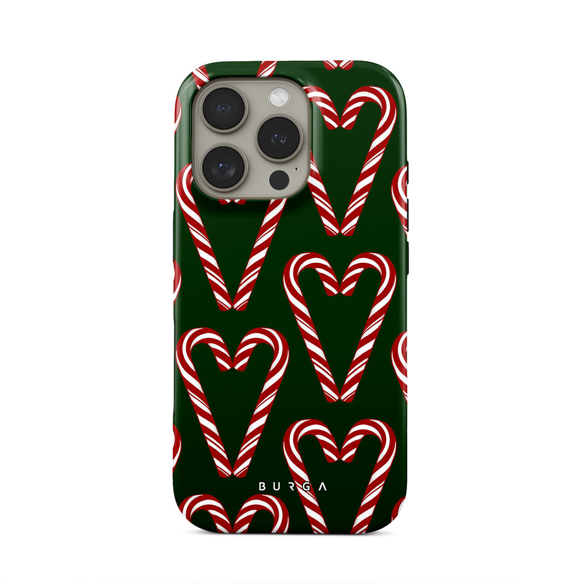 Vibrant and playful, our Candy Cane iPhone 16 Pro Case phone case design showcases candy cane heart motifs against a dark green background—a delightful choice for those who love a touch of whimsy and nostalgia.