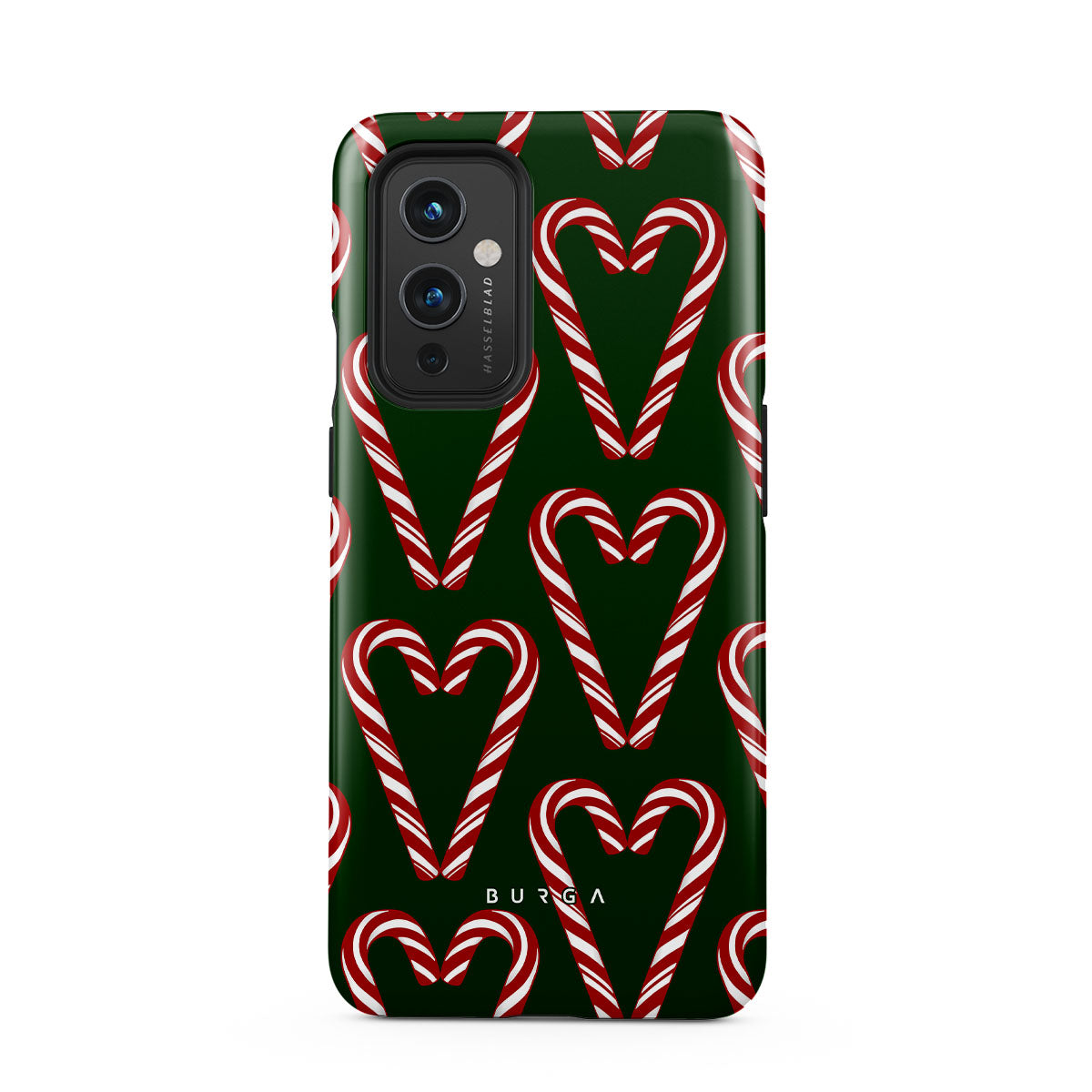 Vibrant and playful, our Candy Cane OnePlus 9 Case phone case design showcases candy cane heart motifs against a dark green background—a delightful choice for those who love a touch of whimsy and nostalgia.