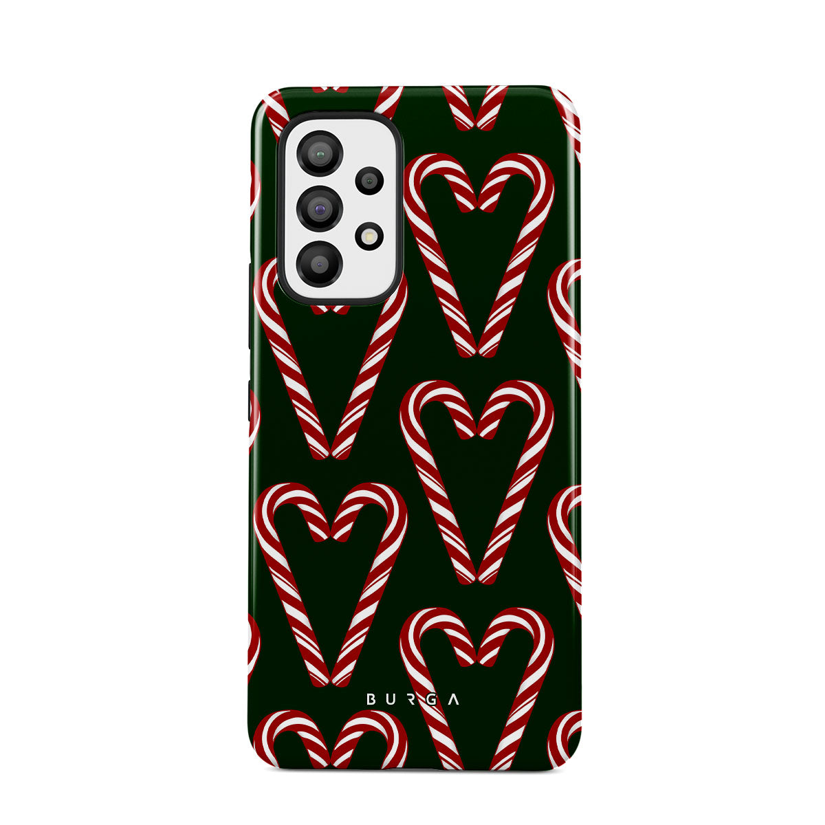 Vibrant and playful, our Candy Cane Samsung Galaxy A53 Case phone case design showcases candy cane heart motifs against a dark green background—a delightful choice for those who love a touch of whimsy and nostalgia.