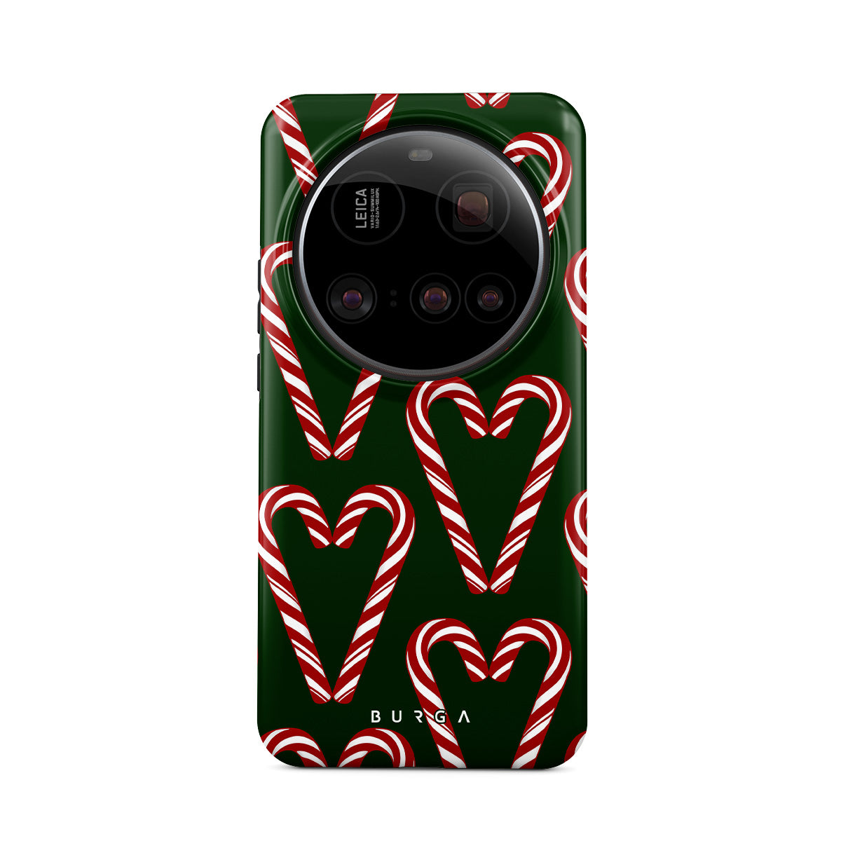Vibrant and playful, our Candy Cane Xiaomi 15 Ultra Case phone case design showcases candy cane heart motifs against a dark green background—a delightful choice for those who love a touch of whimsy and nostalgia.