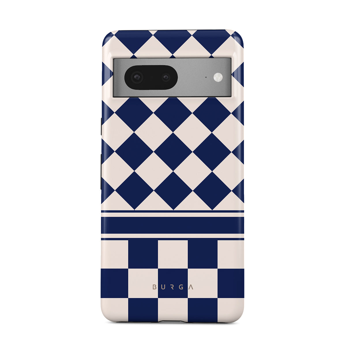 Embrace the essence of subtle luxury with our Check & Mate Google Pixel 7 phone case design. Blending eggshell and deep blue checkers, it evokes whispers of elegance. While diamonds grace the upper half, the lower half features a timeless chessboard pattern.