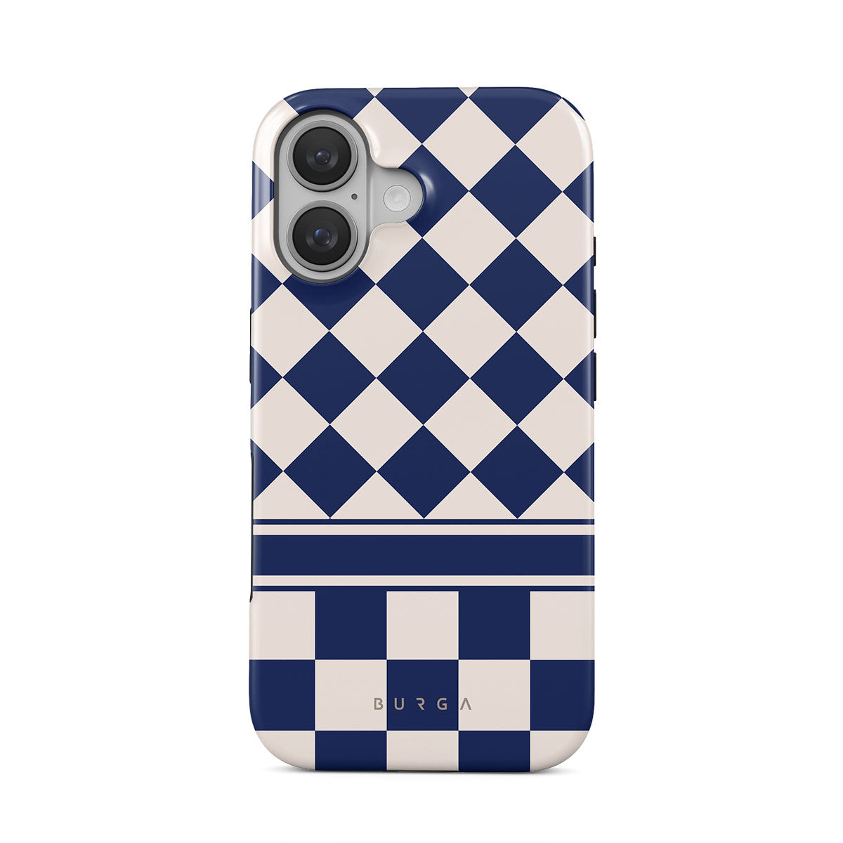 Embrace the essence of subtle luxury with our Check & Mate iPhone 16 Plus phone case design. Blending eggshell and deep blue checkers, it evokes whispers of elegance. While diamonds grace the upper half, the lower half features a timeless chessboard pattern.