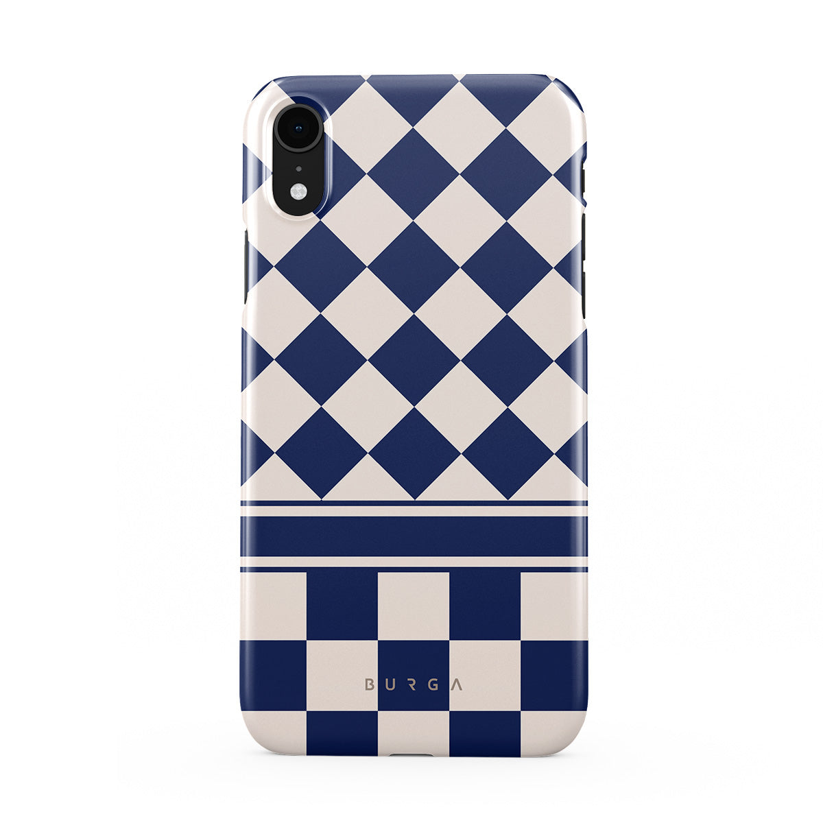 Embrace the essence of subtle luxury with our Check & Mate iPhone XR phone case design. Blending eggshell and deep blue checkers, it evokes whispers of elegance. While diamonds grace the upper half, the lower half features a timeless chessboard pattern.