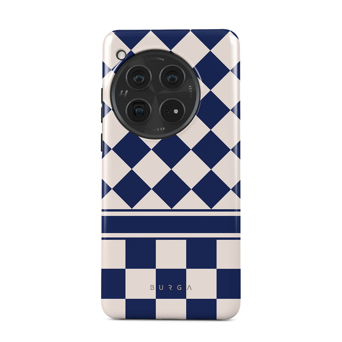 Embrace the essence of subtle luxury with our Check & Mate OnePlus 12 phone case design. Blending eggshell and deep blue checkers, it evokes whispers of elegance. While diamonds grace the upper half, the lower half features a timeless chessboard pattern.