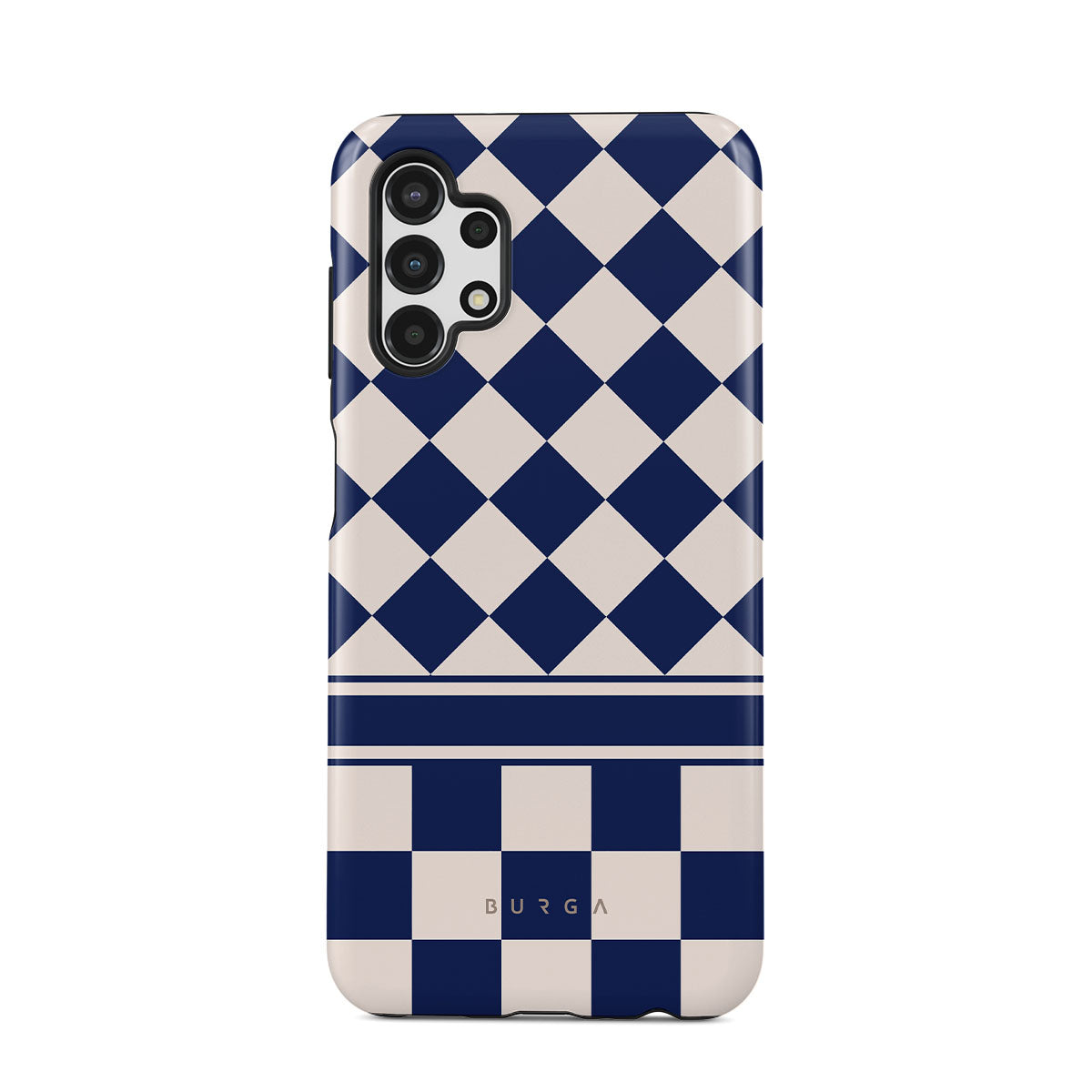 Embrace the essence of subtle luxury with our Check & Mate Samsung Galaxy A13 4G phone case design. Blending eggshell and deep blue checkers, it evokes whispers of elegance. While diamonds grace the upper half, the lower half features a timeless chessboard pattern.