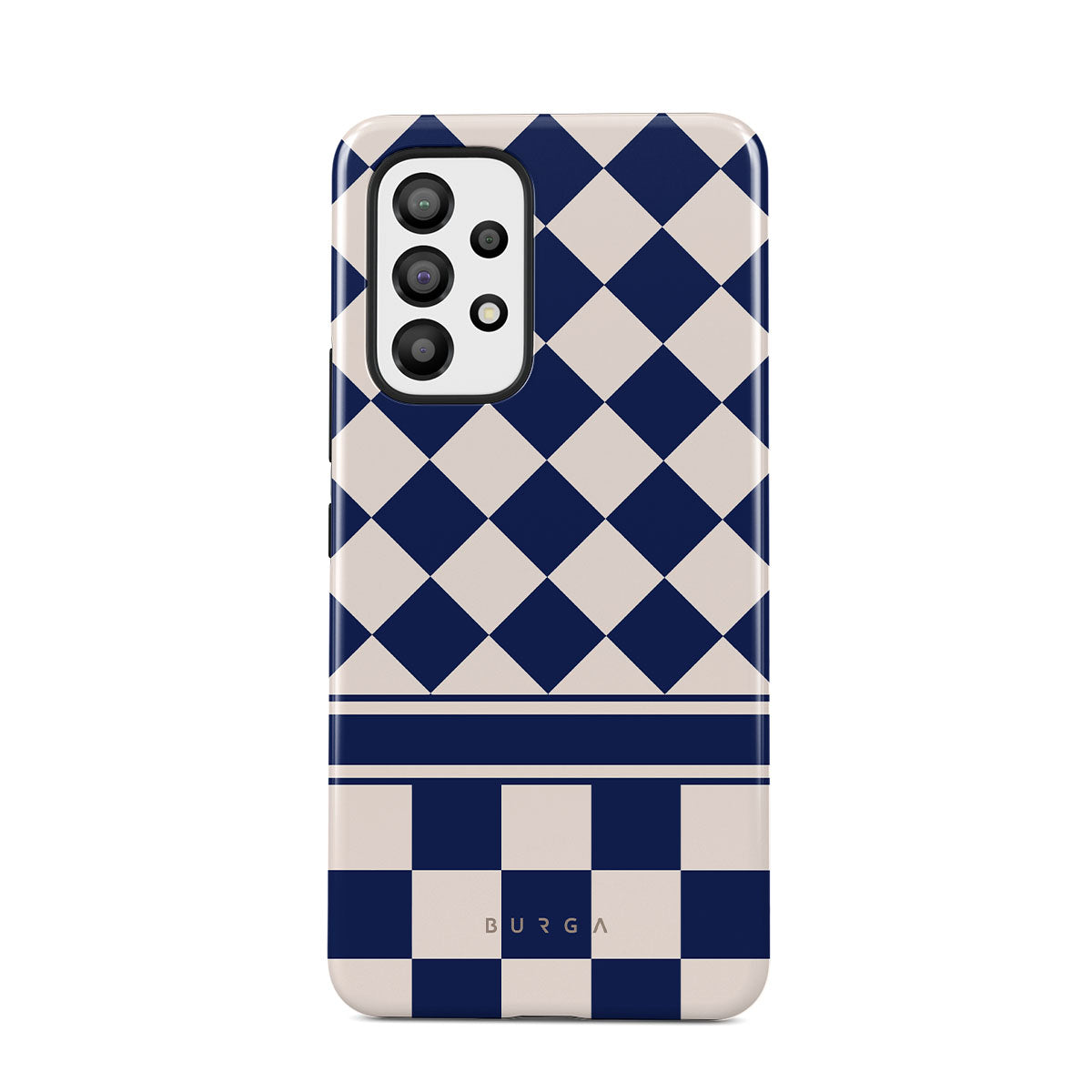 Embrace the essence of subtle luxury with our Check & Mate Samsung Galaxy A73 phone case design. Blending eggshell and deep blue checkers, it evokes whispers of elegance. While diamonds grace the upper half, the lower half features a timeless chessboard pattern.