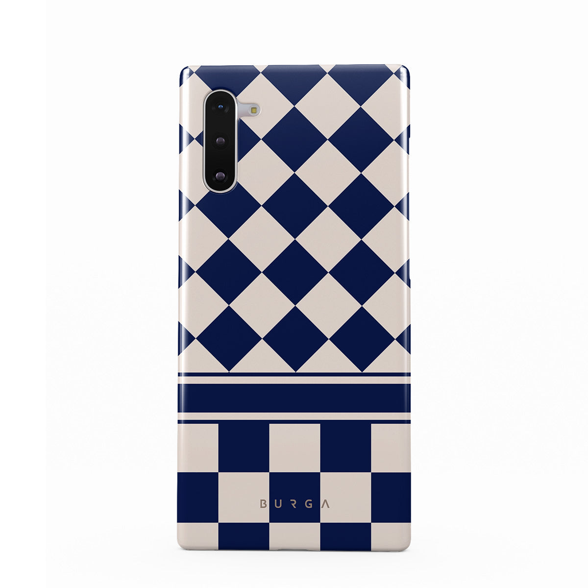 Embrace the essence of subtle luxury with our Check & Mate Samsung Galaxy Note 10 phone case design. Blending eggshell and deep blue checkers, it evokes whispers of elegance. While diamonds grace the upper half, the lower half features a timeless chessboard pattern.