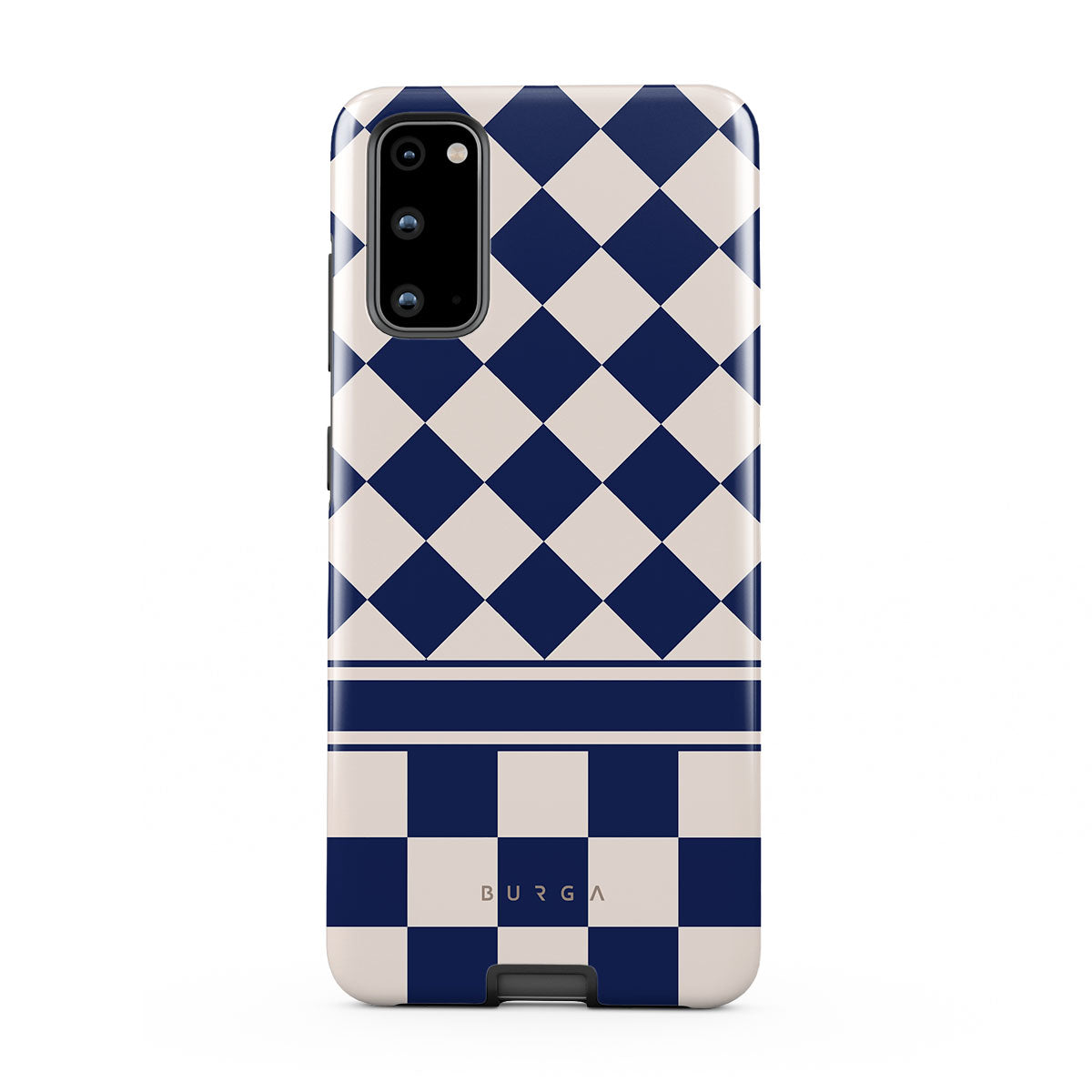 Embrace the essence of subtle luxury with our Check & Mate Samsung Galaxy S20 FE 4G / 5G phone case design. Blending eggshell and deep blue checkers, it evokes whispers of elegance. While diamonds grace the upper half, the lower half features a timeless chessboard pattern.