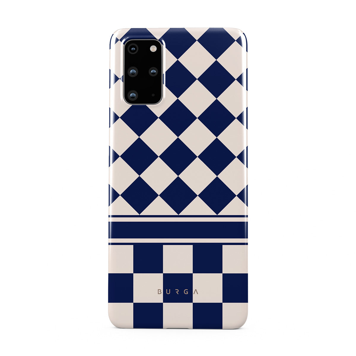 Embrace the essence of subtle luxury with our Check & Mate Samsung Galaxy S20 Plus 4G / 5G phone case design. Blending eggshell and deep blue checkers, it evokes whispers of elegance. While diamonds grace the upper half, the lower half features a timeless chessboard pattern.