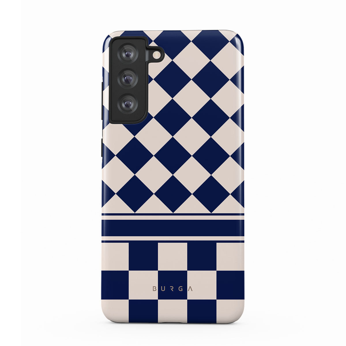 Embrace the essence of subtle luxury with our Check & Mate Samsung Galaxy S21 FE phone case design. Blending eggshell and deep blue checkers, it evokes whispers of elegance. While diamonds grace the upper half, the lower half features a timeless chessboard pattern.