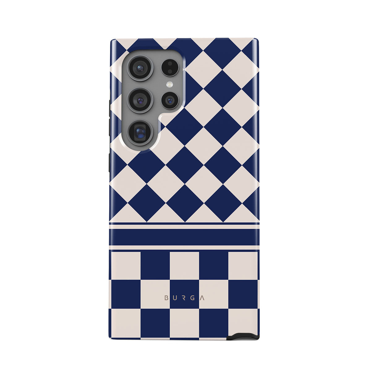 Embrace the essence of subtle luxury with our Check & Mate Samsung Galaxy S24 Ultra phone case design. Blending eggshell and deep blue checkers, it evokes whispers of elegance. While diamonds grace the upper half, the lower half features a timeless chessboard pattern.
