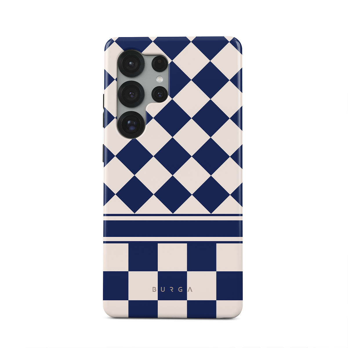 Embrace the essence of subtle luxury with our Check & Mate Samsung Galaxy S25 Ultra phone case design. Blending eggshell and deep blue checkers, it evokes whispers of elegance. While diamonds grace the upper half, the lower half features a timeless chessboard pattern.