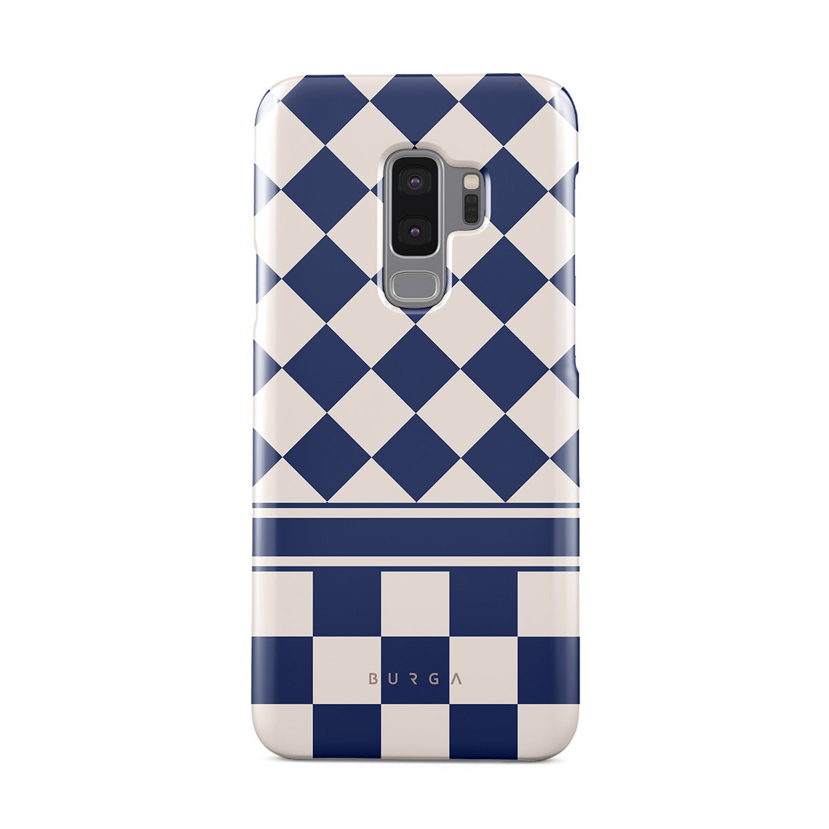 Embrace the essence of subtle luxury with our Check & Mate Samsung Galaxy S9 Plus phone case design. Blending eggshell and deep blue checkers, it evokes whispers of elegance. While diamonds grace the upper half, the lower half features a timeless chessboard pattern.