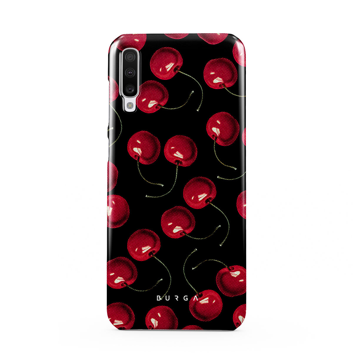 On a deep black background, rich red cherries stand out. Tempting and audacious, our Cherrybomb Samsung Galaxy A70 phone case design is perfect for anyone who likes to keep things simple yet striking.