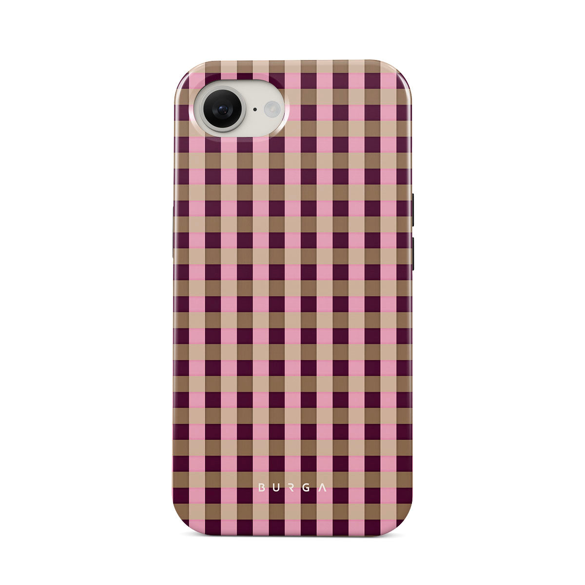 This design features: pink and burgundy plaid pattern, modern checkered style.
