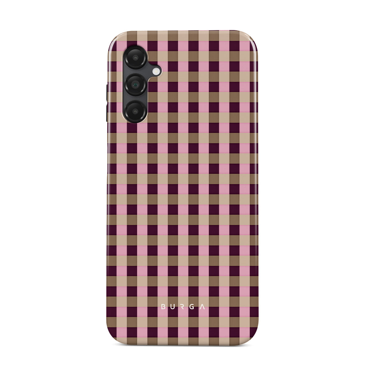 This design features: pink and burgundy plaid pattern, modern checkered style.
