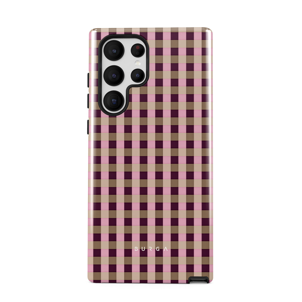 This design features: pink and burgundy plaid pattern, modern checkered style.