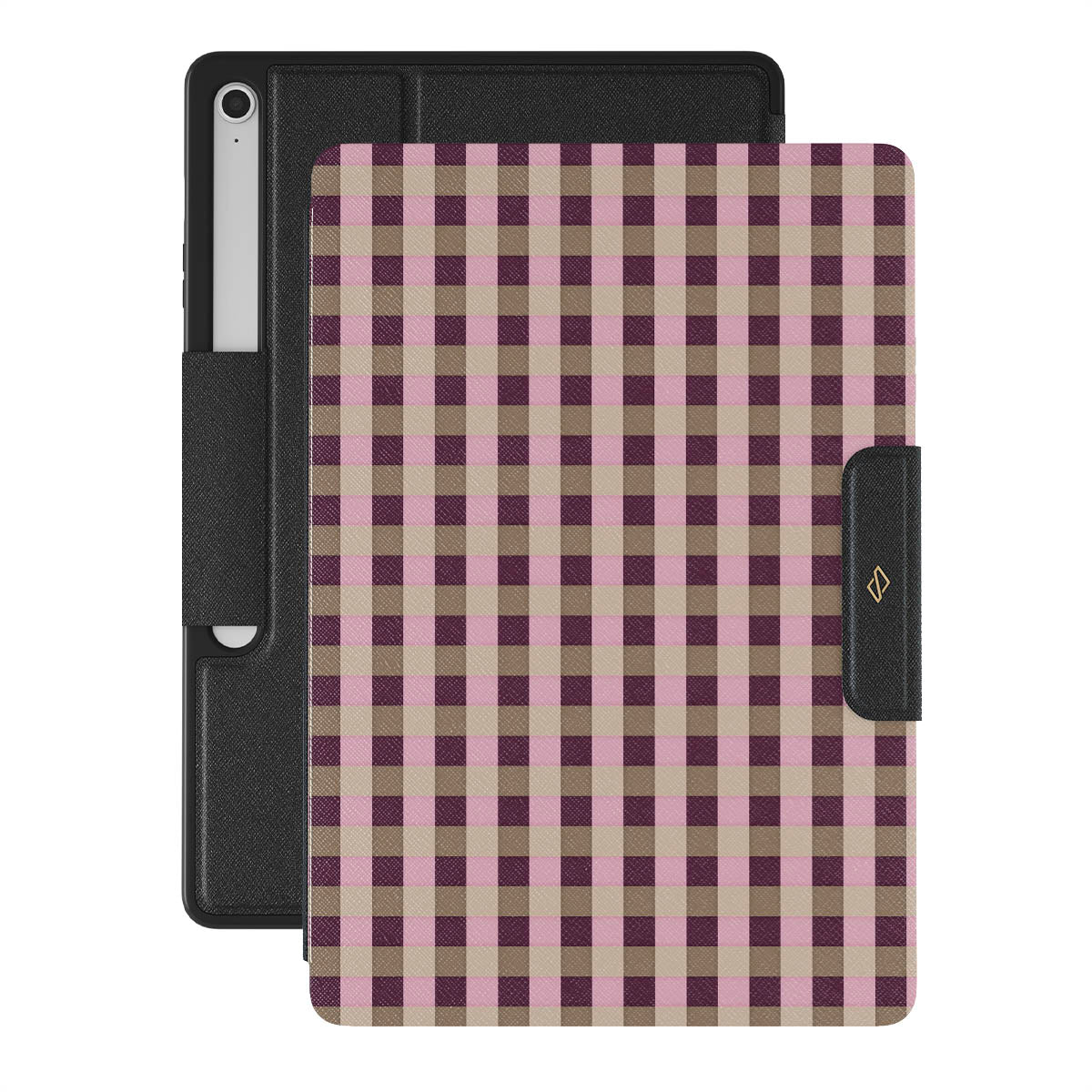 This design features: pink and burgundy plaid pattern, modern checkered style.