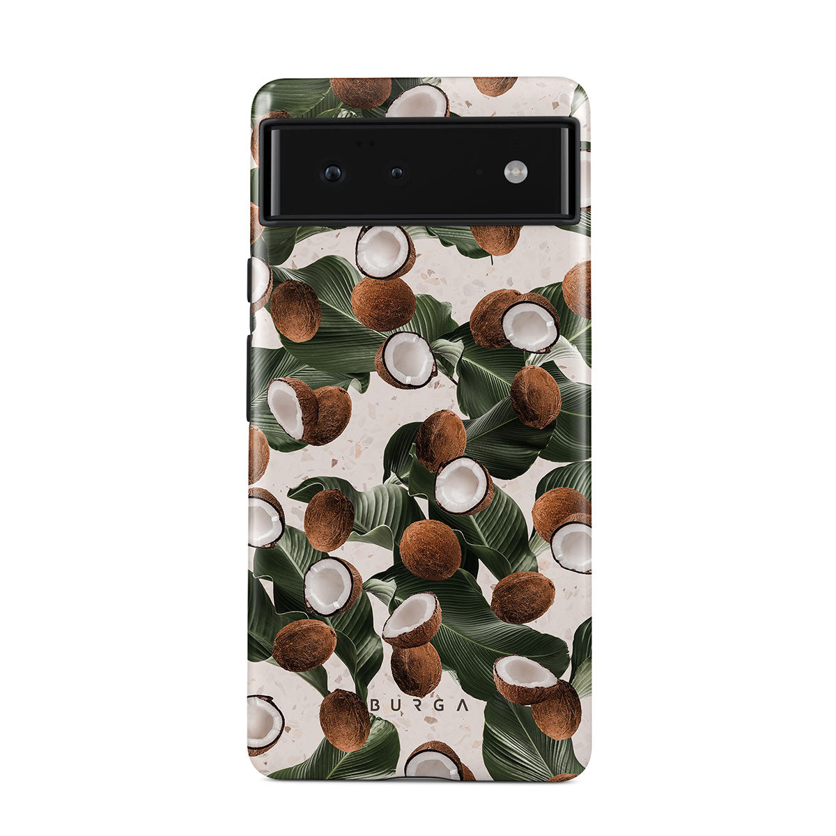 Coconut Crush Google Pixel 6a phone case showcases a soft creme color design with a playful addition of coconuts on top. The unexpected design duo will add a touch of tropical playfulness to your style while offering heavy-duty protection for your cell phone.