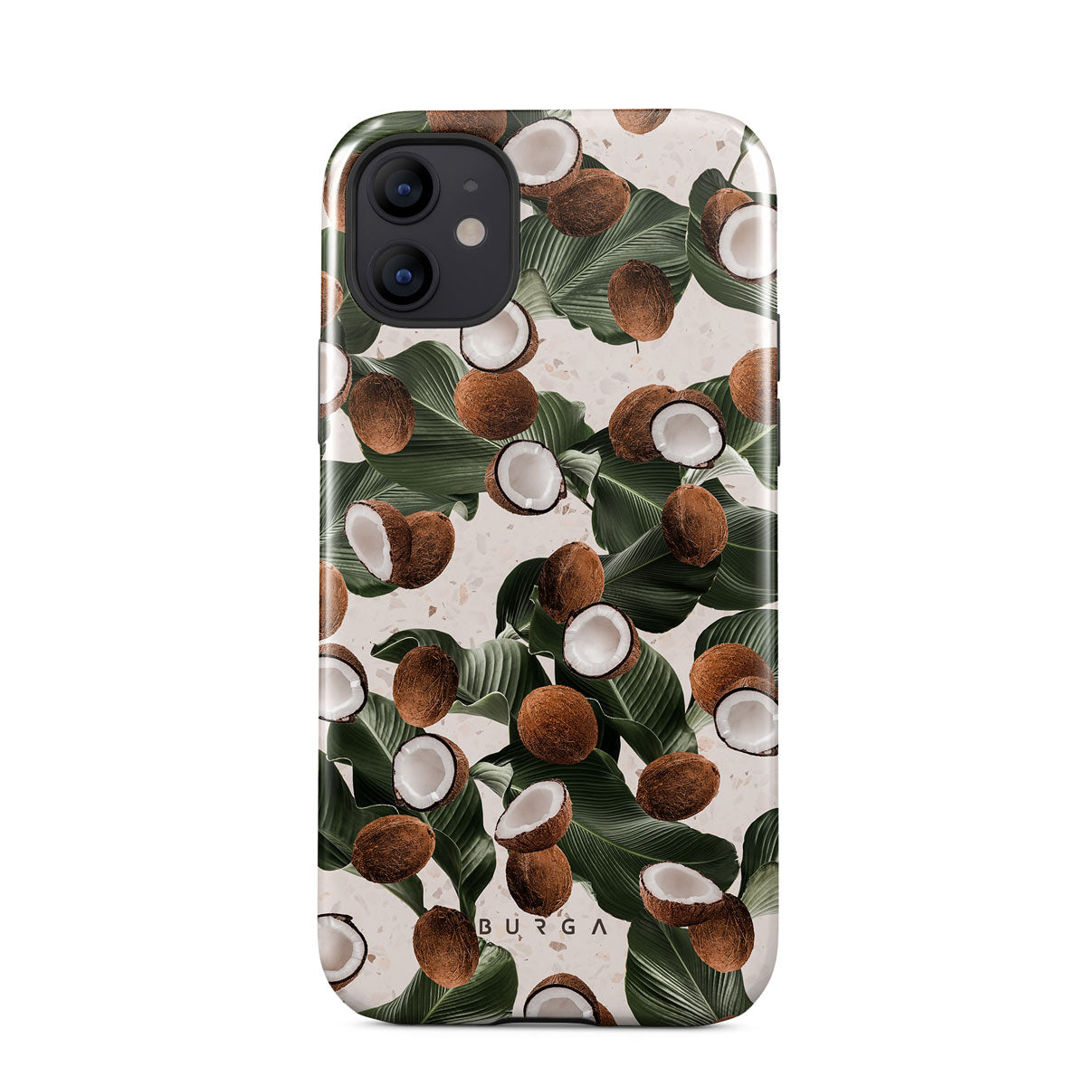 Coconut Crush iPhone 12 phone case showcases a soft creme color design with a playful addition of coconuts on top. The unexpected design duo will add a touch of tropical playfulness to your style while offering heavy-duty protection for your cell phone.