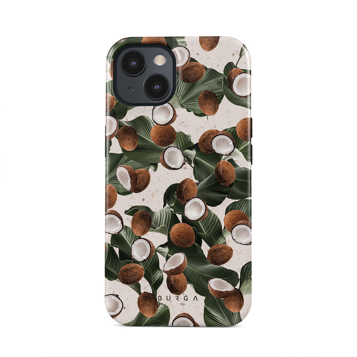 Coconut Crush iPhone 15 phone case showcases a soft creme color design with a playful addition of coconuts on top. The unexpected design duo will add a touch of tropical playfulness to your style while offering heavy-duty protection for your cell phone.