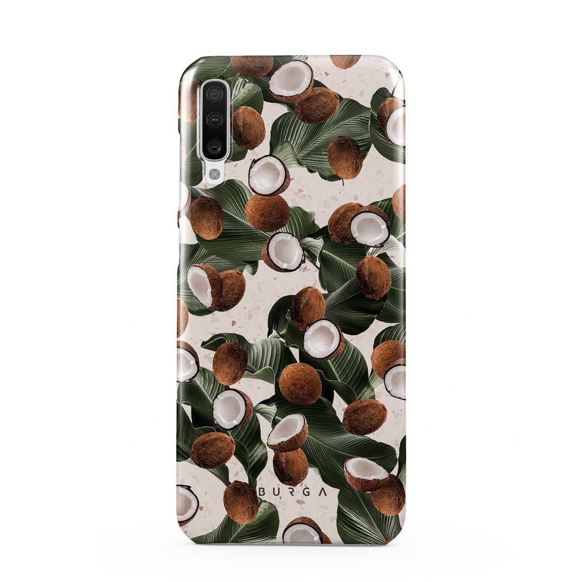 Coconut Crush Samsung Galaxy A70 phone case showcases a soft creme color design with a playful addition of coconuts on top. The unexpected design duo will add a touch of tropical playfulness to your style while offering heavy-duty protection for your cell phone.