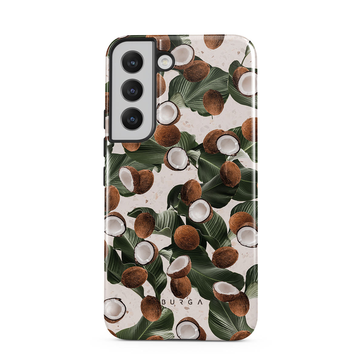 Coconut Crush Samsung Galaxy S22 phone case showcases a soft creme color design with a playful addition of coconuts on top. The unexpected design duo will add a touch of tropical playfulness to your style while offering heavy-duty protection for your cell phone.