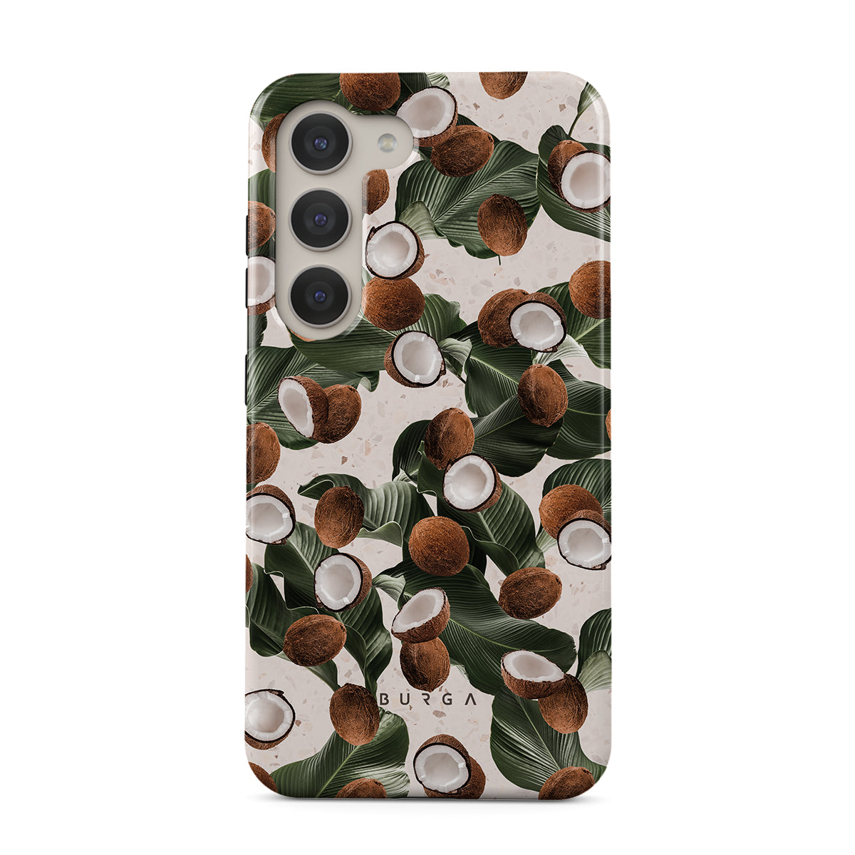 Coconut Crush Samsung Galaxy S23 phone case showcases a soft creme color design with a playful addition of coconuts on top. The unexpected design duo will add a touch of tropical playfulness to your style while offering heavy-duty protection for your cell phone.