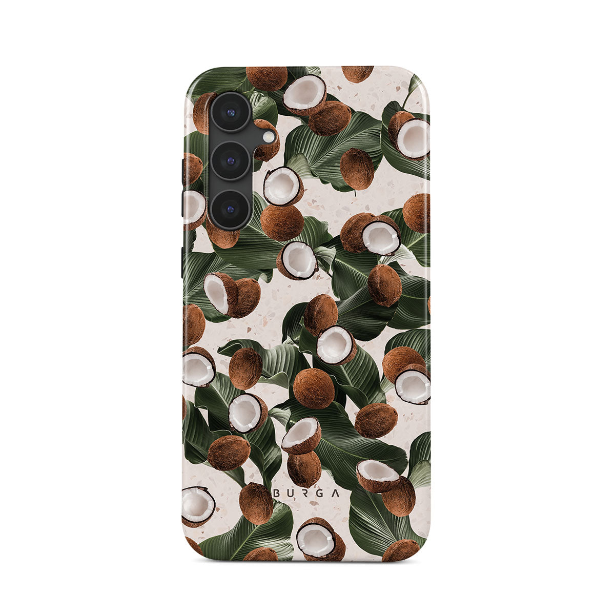 Coconut Crush Samsung Galaxy S23 FE phone case showcases a soft creme color design with a playful addition of coconuts on top. The unexpected design duo will add a touch of tropical playfulness to your style while offering heavy-duty protection for your cell phone.