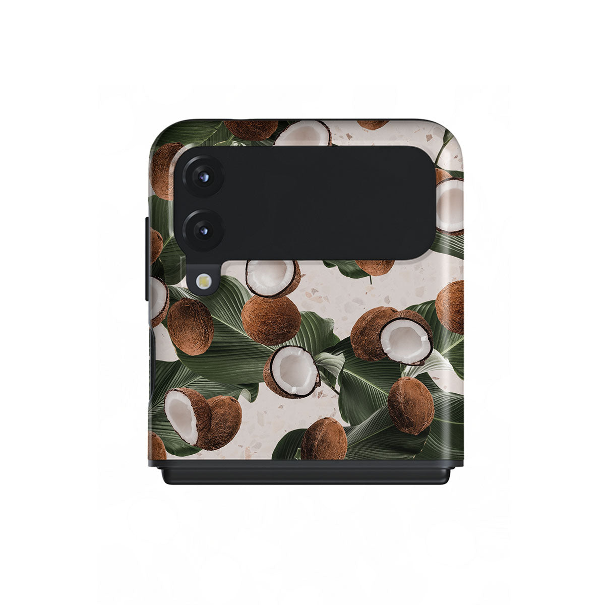 Coconut Crush Samsung Galaxy Z Flip 3 phone case showcases a soft creme color design with a playful addition of coconuts on top. The unexpected design duo will add a touch of tropical playfulness to your style while offering heavy-duty protection for your cell phone.