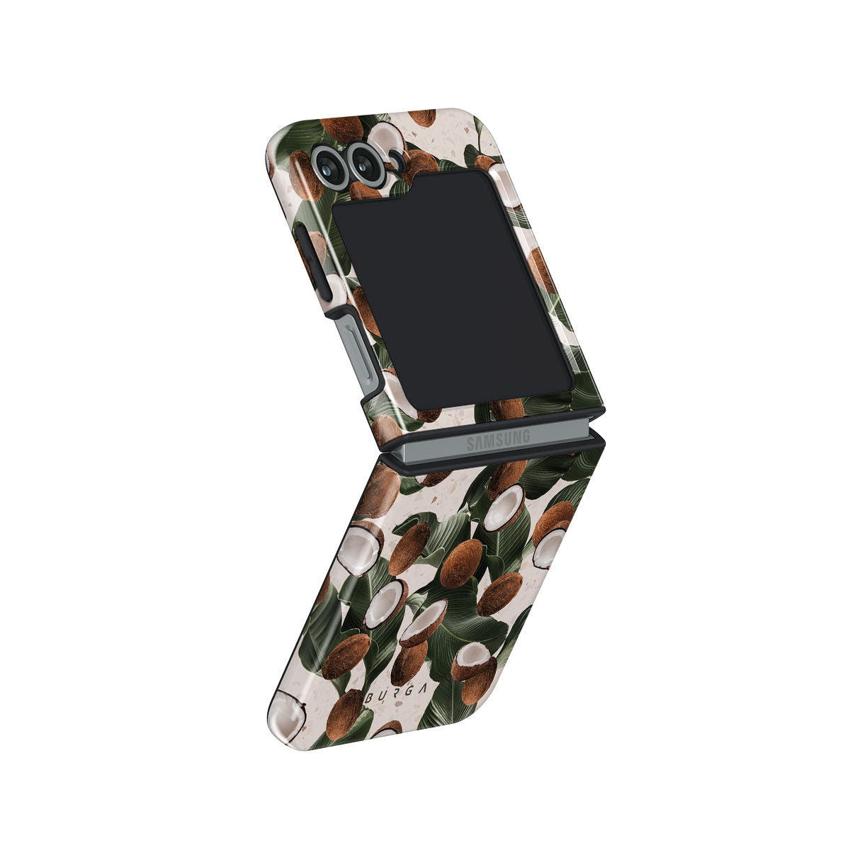 Coconut Crush Samsung Galaxy Z Flip 6 phone case showcases a soft creme color design with a playful addition of coconuts on top. The unexpected design duo will add a touch of tropical playfulness to your style while offering heavy-duty protection for your cell phone.