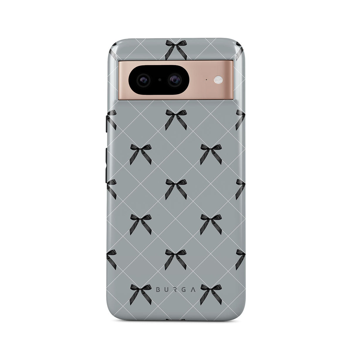 A subtle hint to a world of dance and soft melodies. Crisscrossing bows over a muted gray tone capture the flirtatious essence of the coquette-core aesthetic. Playful and sweet, our Coquette Google Pixel 8 phone case design is perfect for those who find beauty in the details.