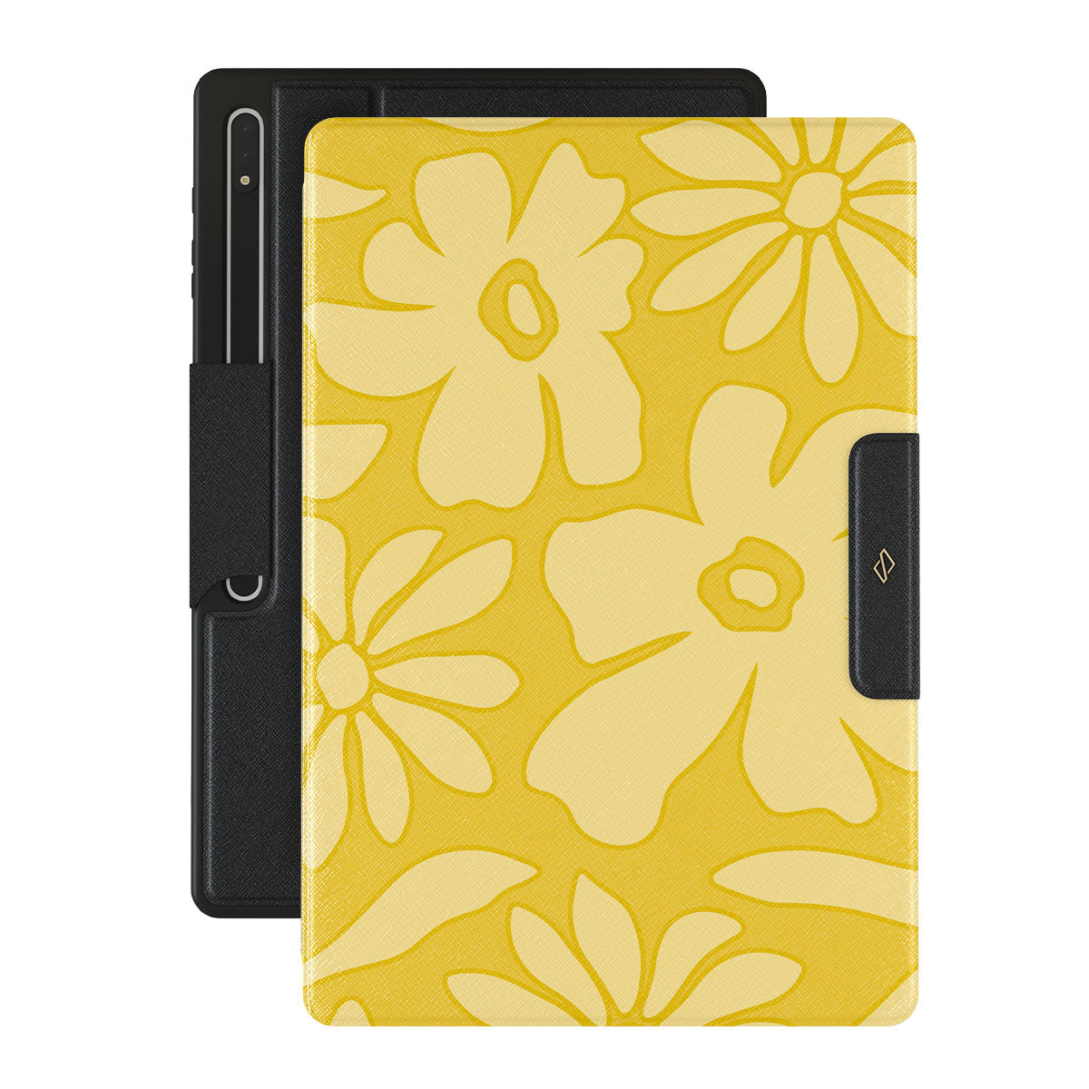 Our bright yellow Samsung Galaxy Tab S9 Ultra folio case features bold, beautiful flowers that evoke a sense of nostalgia and happiness. This cheerful floral design captures the essence of joyful moments, making your device a reminder of sunny memories. Perfect for brightening up your day.