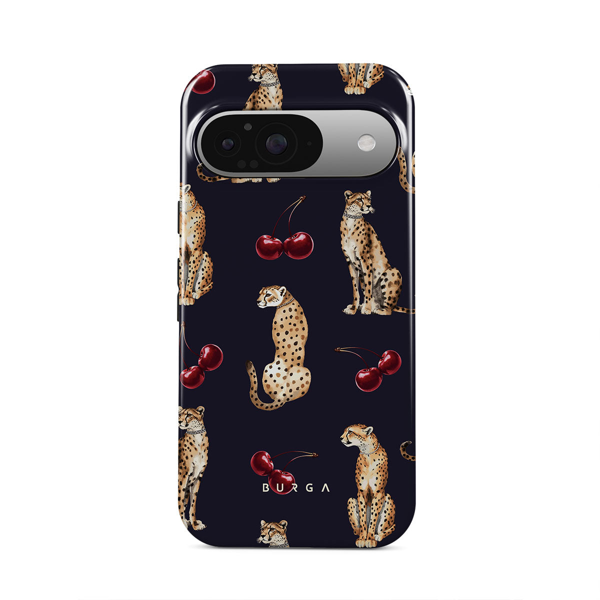 This design features: cheetah patterns, cheetahs, cherries
