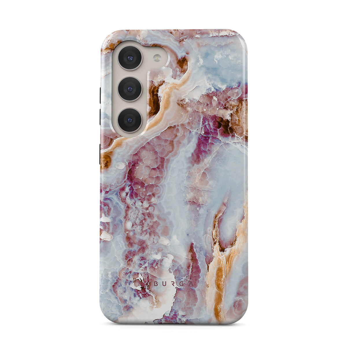 What frost can create on the surfaces is perfectly imperfect. The cute marble pattern of our hard-shell Samsung Galaxy S23 phone case inspired by the frozen leaves adds a splash of color in a dreamy blue background, becoming a beautiful part of anyone's style.