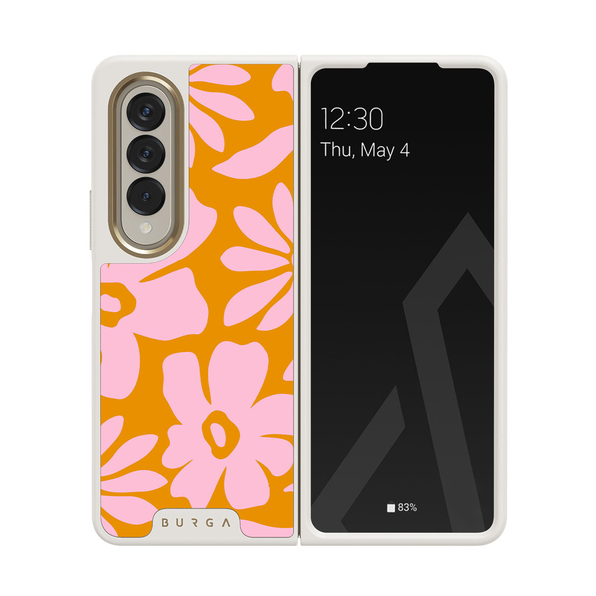 Step into a world of vibrant celebration with our Daytime Fiesta. Delicate pastel pink flowers dance against a backdrop of electrifying orange, creating a captivating fusion of color. Embrace the positive energy of this beautiful design and let your Samsung Galaxy Z Fold 4 phone case radiate the spirit of a lively fiesta wherever you go.
