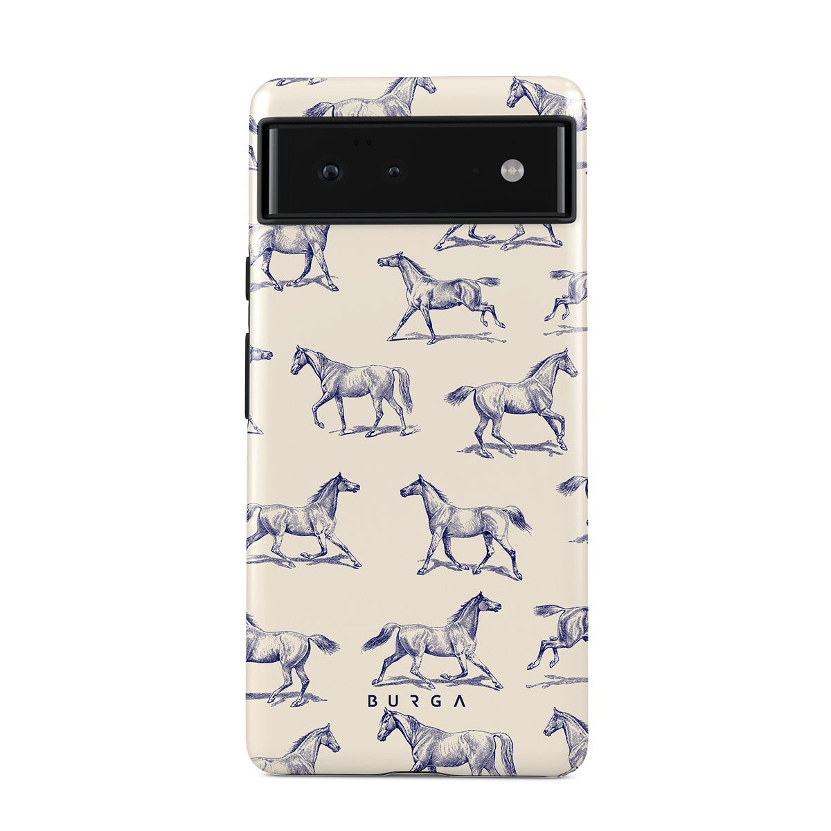 Introducing our Derby Race Google Pixel 6a phone case designa portrait of elegance in motion on a soft nude canvas. Engraved in delicate blue contours, galloping horses dance upon the wind, frozen in an exquisite moment of grace.