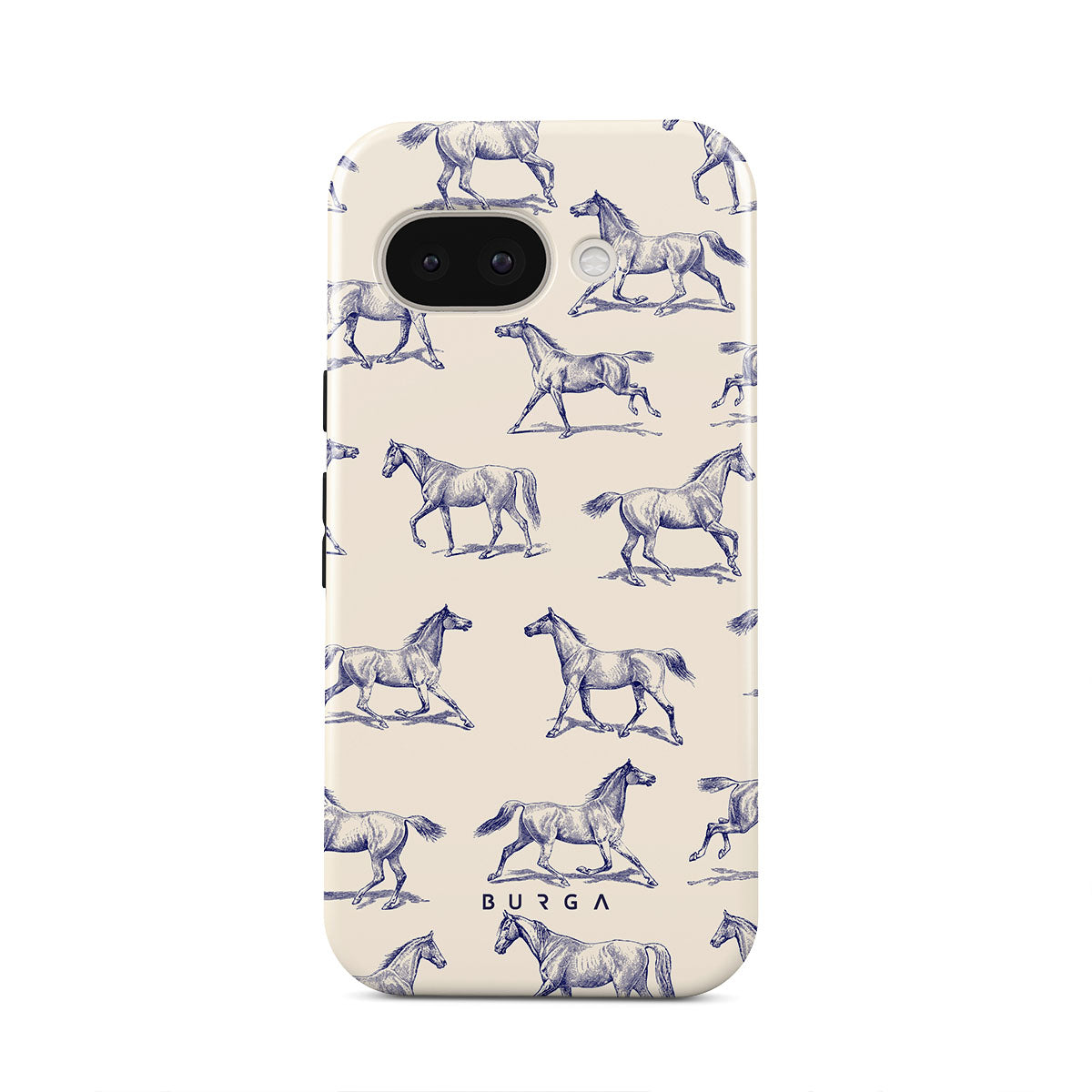 Introducing our Derby Race Google Pixel 9a phone case design—a portrait of elegance in motion on a soft nude canvas. Engraved in delicate blue contours, galloping horses dance upon the wind, frozen in an exquisite moment of grace.