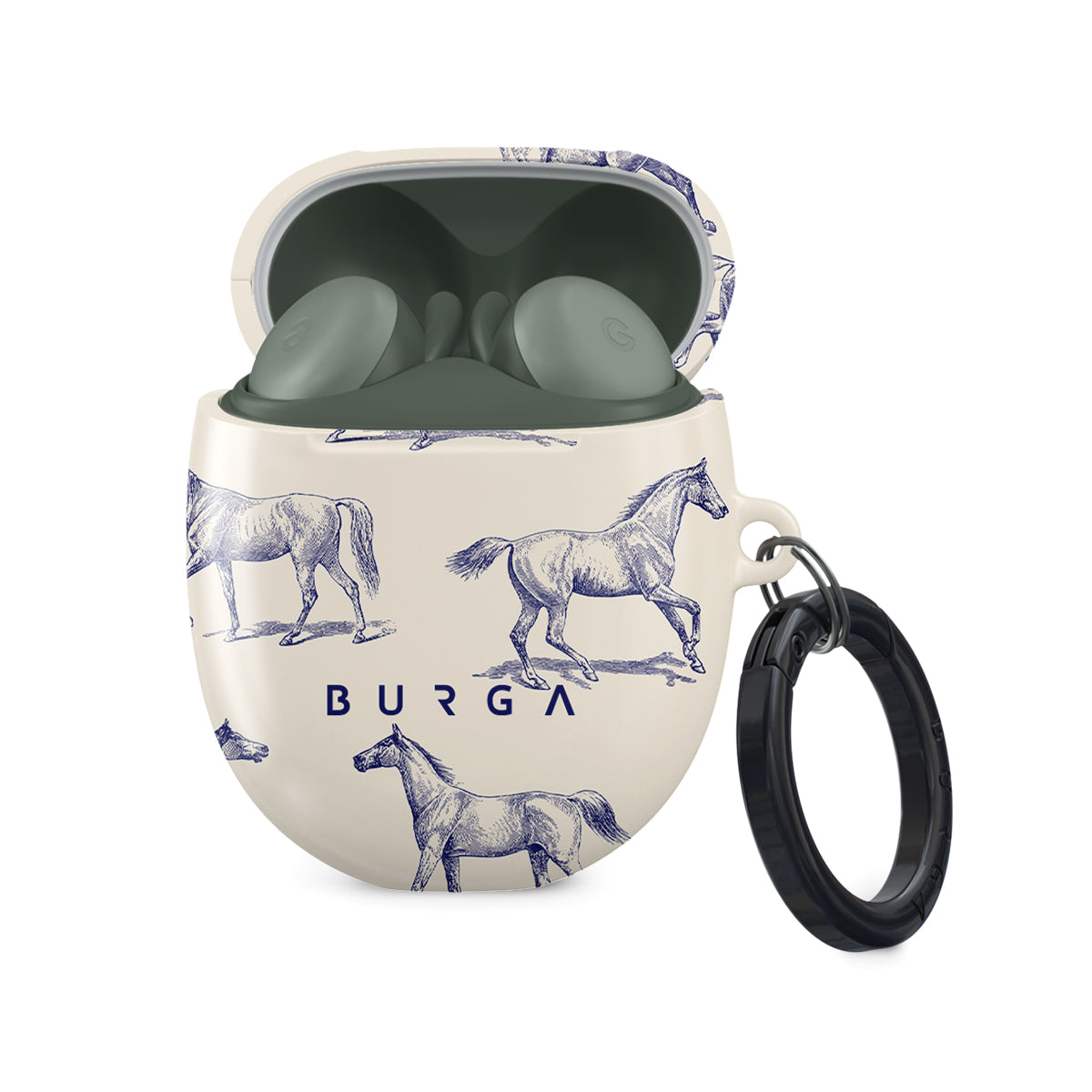 Introducing our Derby Race Google Pixel Buds A case cover designa portrait of elegance in motion on a soft nude canvas. Engraved in delicate blue contours, galloping horses dance upon the wind, frozen in an exquisite moment of grace.