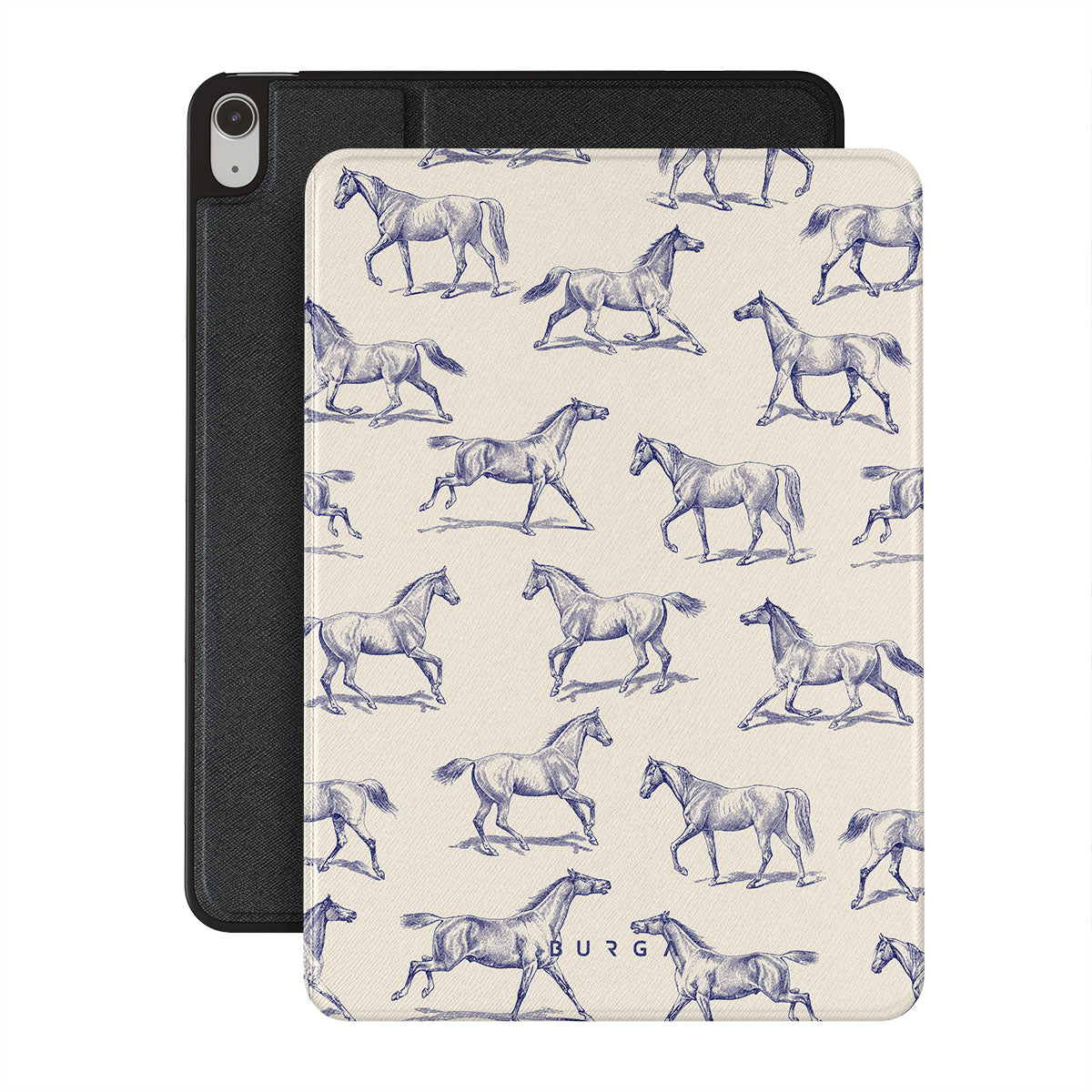 Introducing our Derby Race iPad Air 11 (7th/6th Gen) folio case designa portrait of elegance in motion on a soft nude canvas. Engraved in delicate blue contours, galloping horses dance upon the wind, frozen in an exquisite moment of grace.