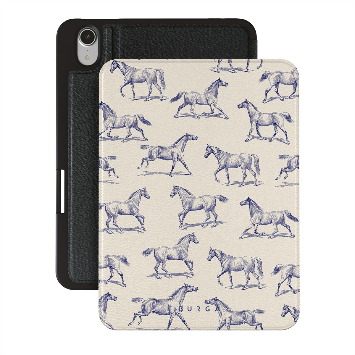 Introducing our Derby Race iPad Mini 8.3 (A17 Pro/6th Gen) 2021 folio case designa portrait of elegance in motion on a soft nude canvas. Engraved in delicate blue contours, galloping horses dance upon the wind, frozen in an exquisite moment of grace.