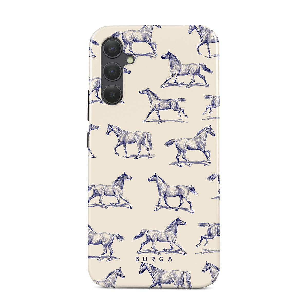 Introducing our Derby Race Samsung Galaxy A34 phone case designa portrait of elegance in motion on a soft nude canvas. Engraved in delicate blue contours, galloping horses dance upon the wind, frozen in an exquisite moment of grace.
