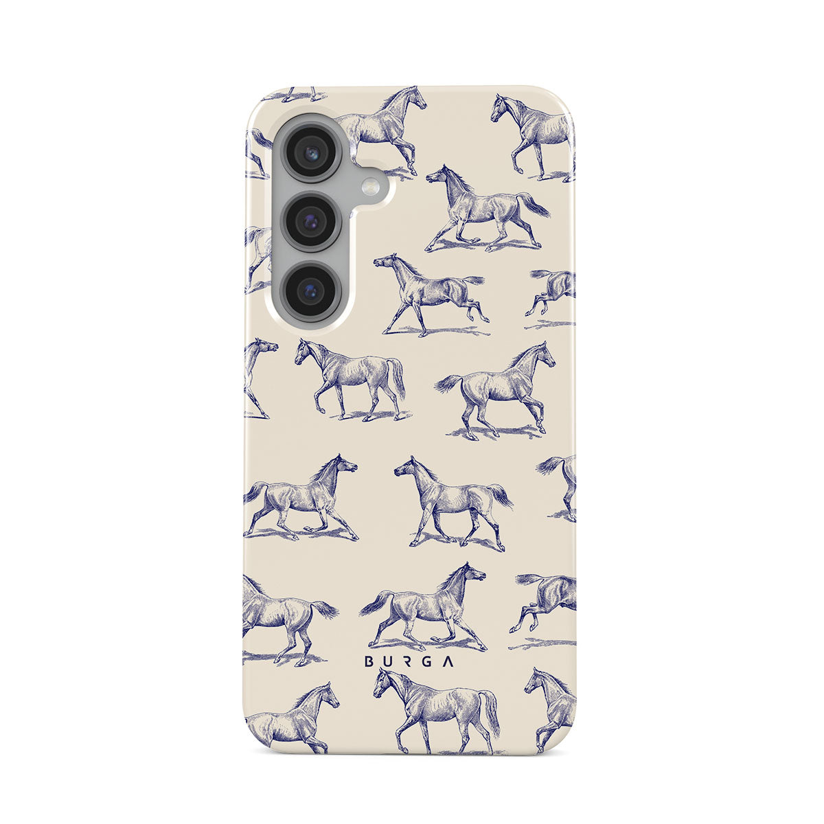 Introducing our Derby Race Samsung Galaxy S24 FE phone case design—a portrait of elegance in motion on a soft nude canvas. Engraved in delicate blue contours, galloping horses dance upon the wind, frozen in an exquisite moment of grace.