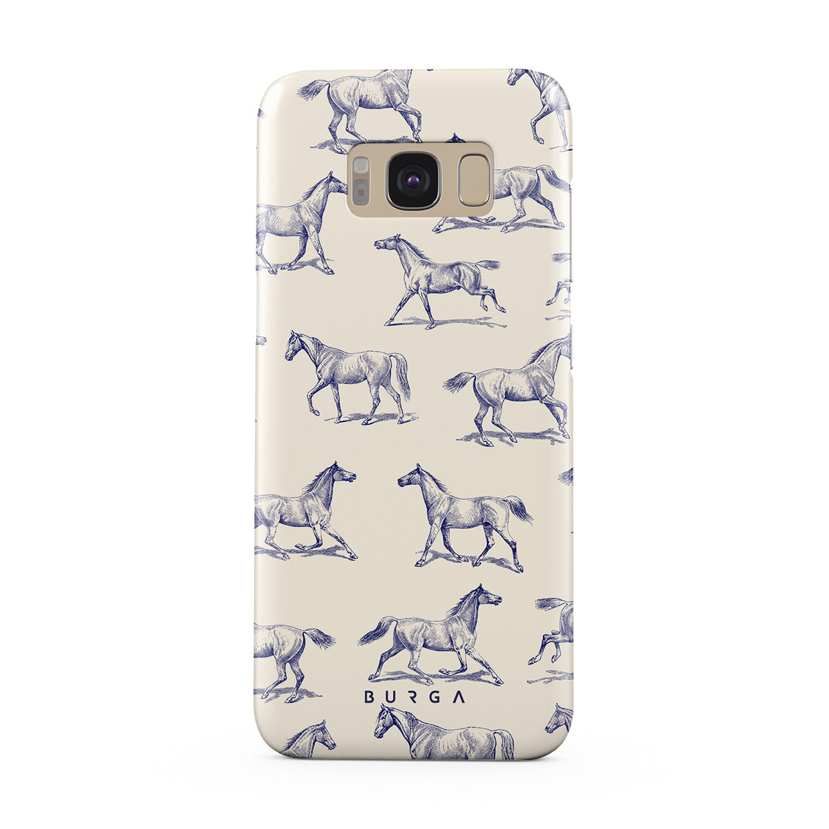 Introducing our Derby Race Samsung Galaxy S8 phone case designa portrait of elegance in motion on a soft nude canvas. Engraved in delicate blue contours, galloping horses dance upon the wind, frozen in an exquisite moment of grace.