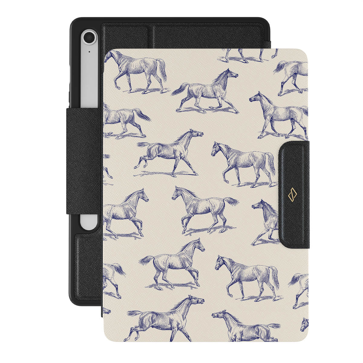 Introducing our Derby Race Samsung Galaxy Tab S10 FE folio case design—a portrait of elegance in motion on a soft nude canvas. Engraved in delicate blue contours, galloping horses dance upon the wind, frozen in an exquisite moment of grace.