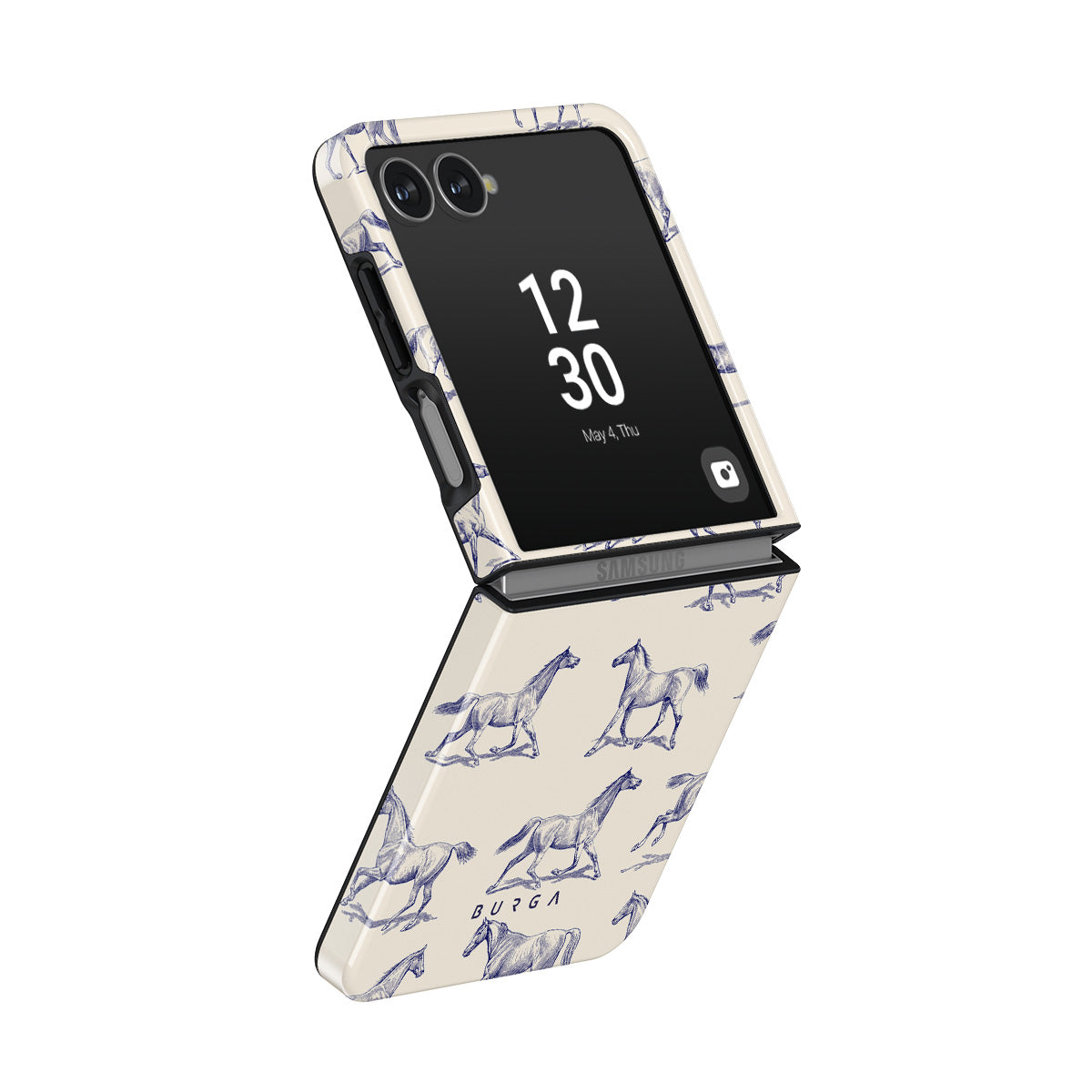 Introducing our Derby Race Samsung Galaxy Z Flip 7 phone case design—a portrait of elegance in motion on a soft nude canvas. Engraved in delicate blue contours, galloping horses dance upon the wind, frozen in an exquisite moment of grace.
